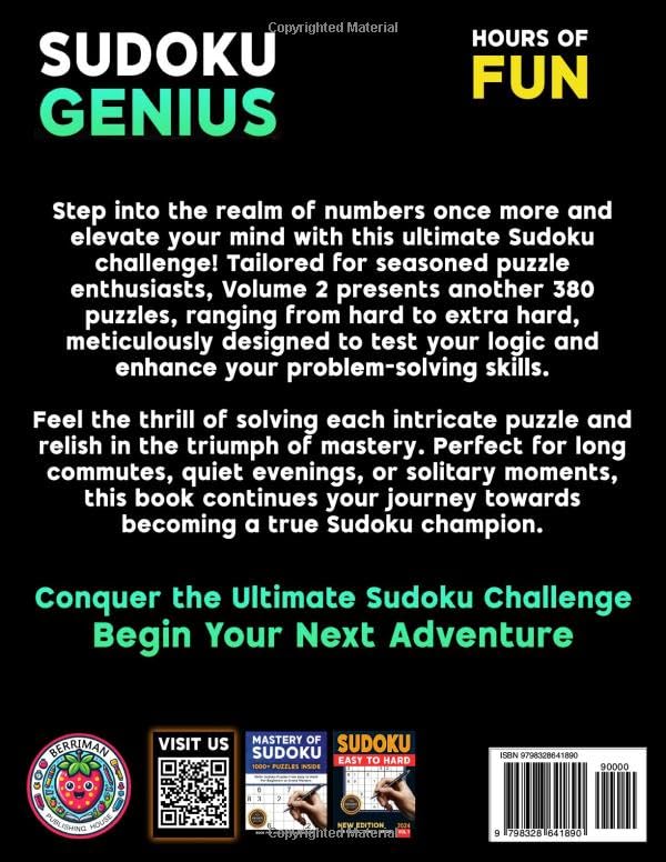 This volume continues the challenge for dedicated solvers who demand more from every grid. Sudoku Genius Hard to Extremely Hard Volume 2 delivers a fresh collection of carefully crafted puzzles designed to push logic, patience, and focus to the limit.