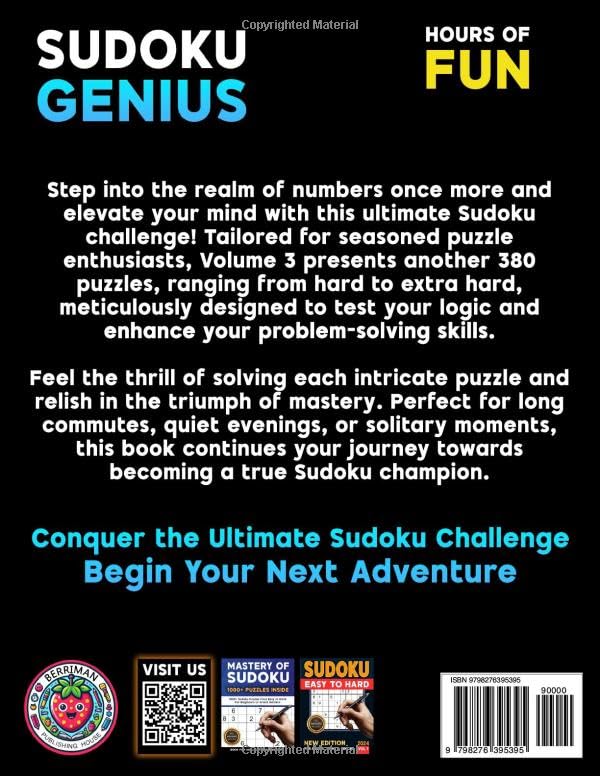 Designed for solvers who refuse to settle for ordinary puzzles, Sudoku Genius Hard to Extremely Hard Volume 3 raises the bar once again. This volume delivers an uncompromising collection of advanced grids built to challenge even seasoned Sudoku veterans.