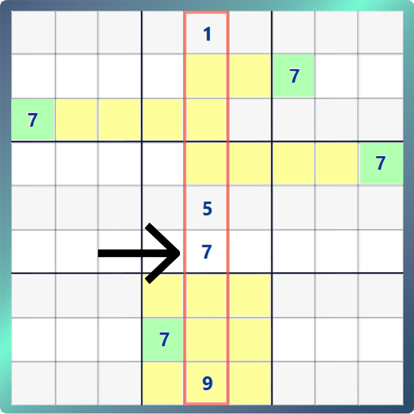 If you now look at the below example, you will notice that there is a missing a 7 in the highlighted column, but there are 7’s elsewhere on the board. By remembering that numbers 1-9 cannot be duplicated in any box, column or row, and by looking at the placement of the 7’s outside of the highlighted column, we can identify the only suitable cell within the highlight column to place the 7.
